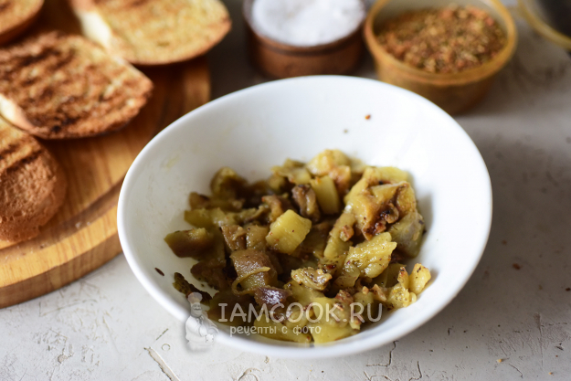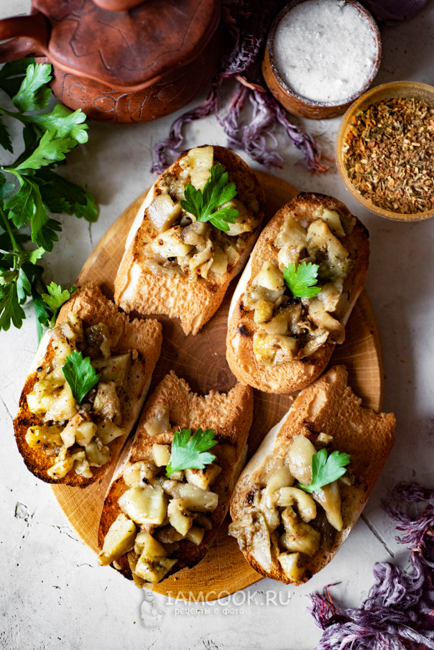 Выложим мякоть баклажанов на ломтики багета, украсим зеленью, подадим брускетты с баклажанами к столу. Приятного аппетита!