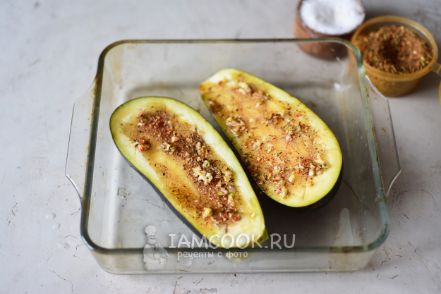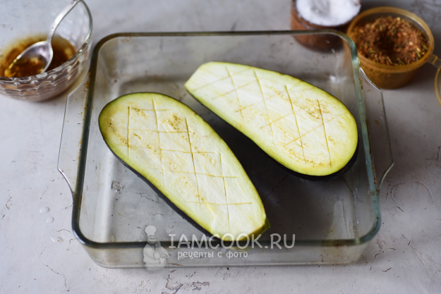 Баклажан разрежем продольно на две части и сделаем глубокие надрезы, выложим в форму для запекания.