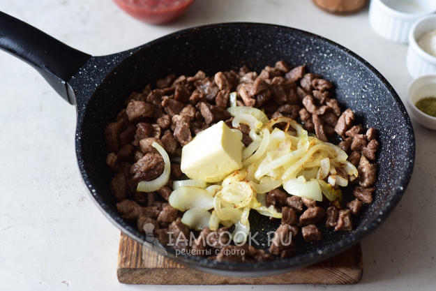 К мясным кусочкам добавим обжаренный лук и кусочек сливочного масла. Убавим огонь до среднего и, помешивая, дождемся, когда масло полностью растопится.
