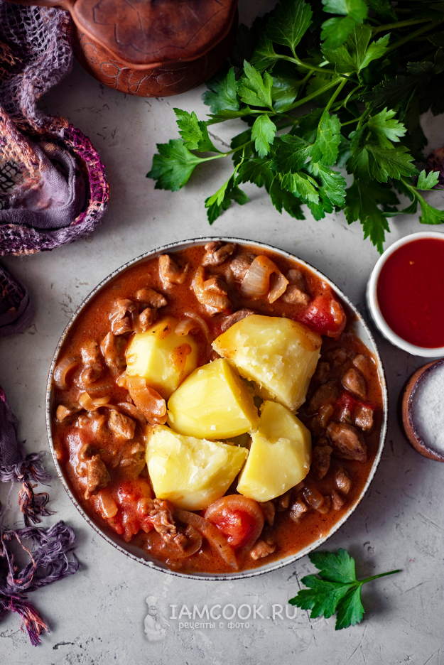 Горячий гуляш из свинины и говядины (вместе) с подливкой подаем с любимым гарниром, например с отварным картофелем, - это невероятно вкусно и сытно! Приятного аппетита!