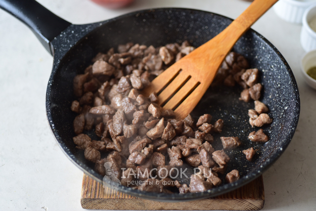 В другой сковороде хорошо разогреем растительное масло (2-3 ст.л.) на максимальном огне и выложим все мясные кусочки - будем обжаривать, активно помешивая лопаткой, до полного выпаривания жидкости.