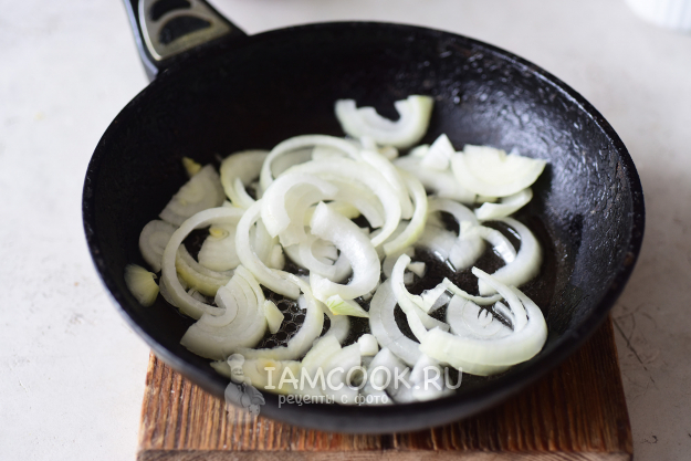 В отдельной сковороде в растительном масле обжарим до мягкости лук, нарезанный полукольцами.