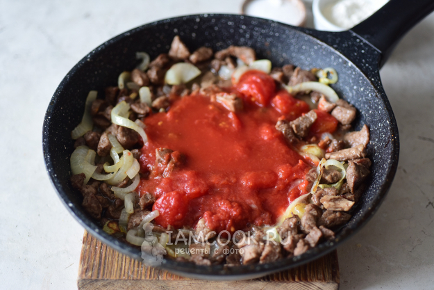 Затем добавим томаты в собственном соку, предварительно произвольно нарезав их, перемешаем, будем тушить на маленьком огне под закрытой крышкой 15 минут.