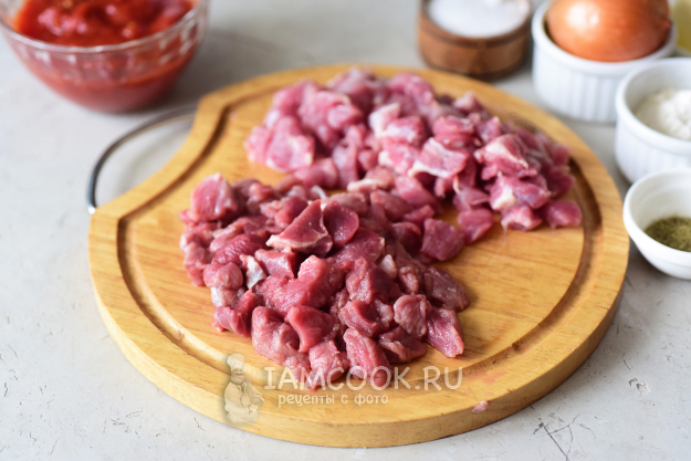 Мякоть говядины нарежем небольшими кусочками, так же поступим и со свининой.