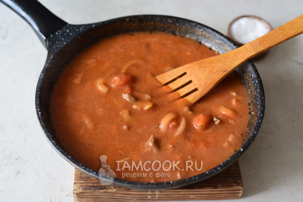 Эту мучную смесь зальем в сковороду, добавим соль и хмели-сунели. Продолжаем тушить, помешивая, до загустевания подливки.