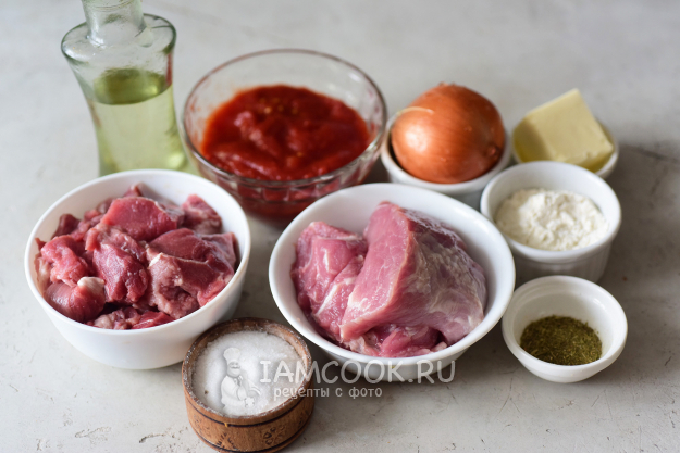 Соберём необходимые ингредиенты для приготовления гуляша из свинины и говядины (вместе) с подливкой. Лук почистим.