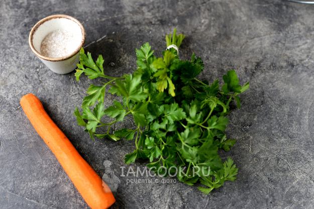 Почистите морковку, помойте вместе с петрушкой. Морковь порежьте ломтиками, петрушку порвите руками, добавьте в сковороду, готовьте еще 10 минут.