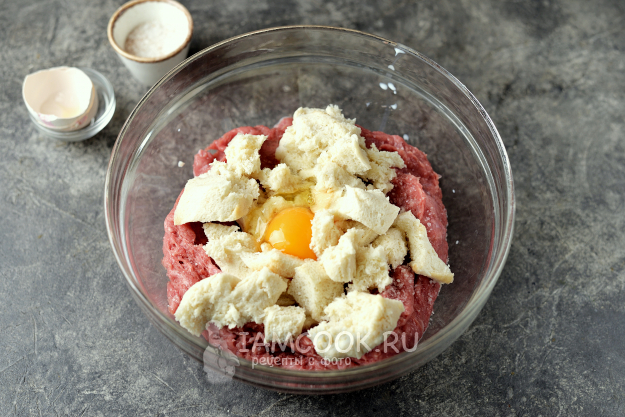 Переложите фарш в глубокую миску, добавьте отжатый от молока хлеб и крупное яйцо, посолите немного.