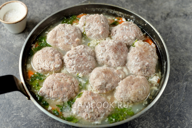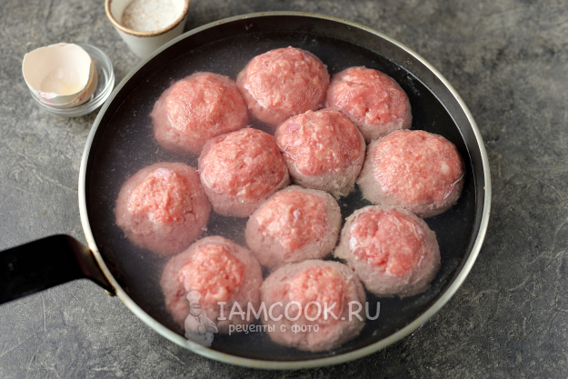 Мокрыми руками сформируйте тефтели среднего размера, переложите в сковороду, залейте кипятком из чайника. Воду чуть-чуть присолите, готовьте тефтели на тихом огне минут 10. В середине приготовления переверните тефтели на обратную сторону.
