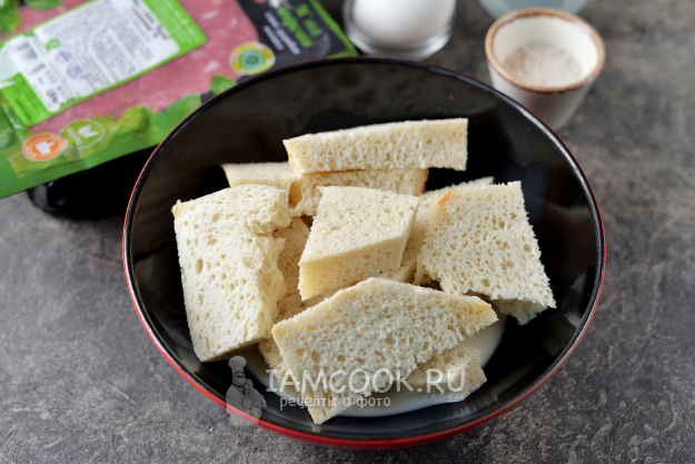 С черствого обеденного батона срежьте все корки, мякиш нарежьте или поломайте руками, переложите в глубокую миску. Залейте хлеб молоком, дайте ему хорошо набухнуть.