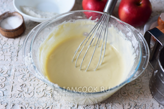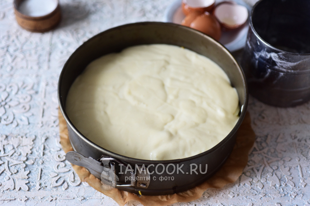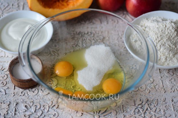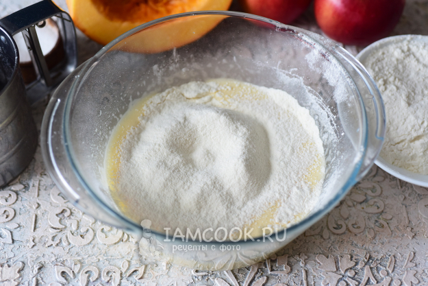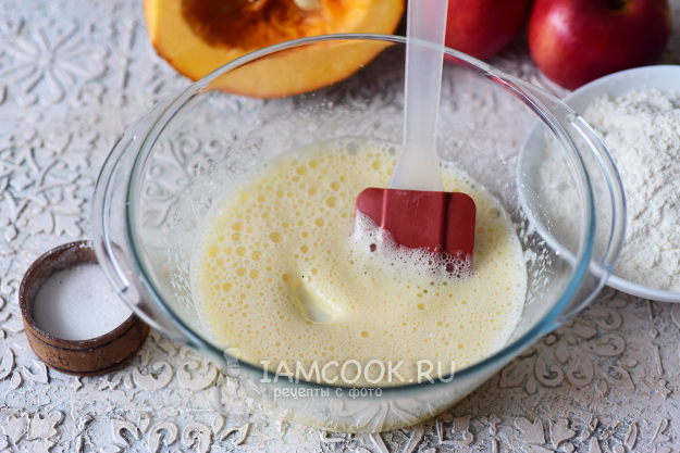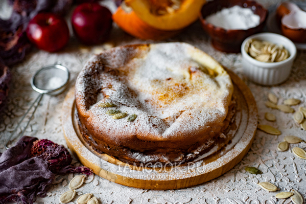 На тыкву и яблоки выльем тесто, отправим заполненную форму в уже разогретую до 180 градусов духовку примерно на 40 минут.