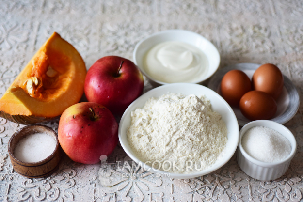 Подготовим необходимые ингредиенты для заливного пирога с тыквой и яблоками. Кусочек тыквы очистим от кожуры и семян, яблоки помоем.