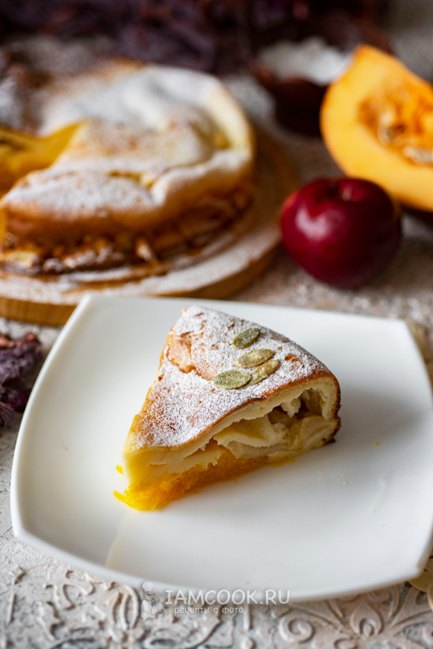 Готовый заливной пирог с тыквой и яблоками обязательно полностью охладим и только тогда приступим к нарезке на порционные кусочки.