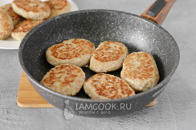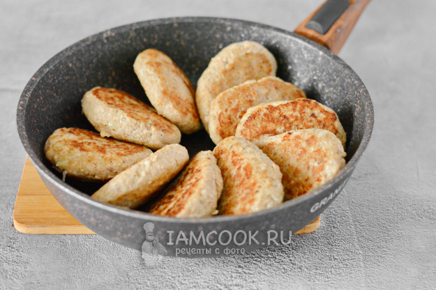 Когда все котлеты обжарены, верните их все обратно в сковороду, влейте сюда же немного кипятка из чайника (слоем около 1 см). Накройте крышкой, доведите до кипения, убавьте огонь и на среднем огне потомите котлеты из индейки и свинины на сковороде около 15-20 минут. Так котлеты будут очень сочными и не пересушенными.