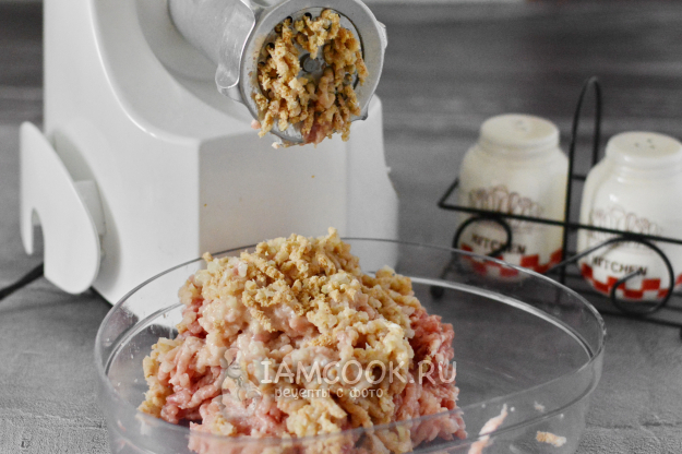 Следом за ними пропустите через мясорубку хлеб и лук.