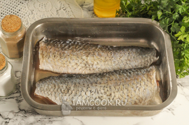 Спустя указанное время тушка выделит много жидкости и будет солиться в ней. Промойте части амура в воде и поместите в воду на 2-3 часа. Жидкость заберет излишки соли. Просушите части бумажными салфетками.