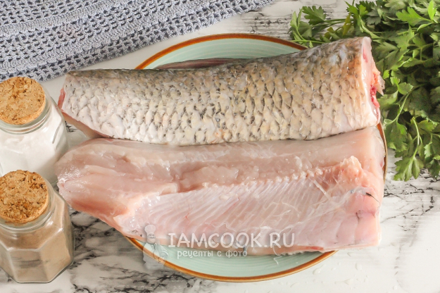 Приобретенного белого амура очистите от чешуи, выпотрошите и тщательно промойте снаружи и внутри. Обязательно счистите внутри брюшка черную пленку - она очень горчит и испортит вкус всего блюда! Срежьте голову, хвост, плавники и разрежьте тушку пополам. Если не любите счищать вяленое мясо с костей, то удалите и хребет, крупные брюшные кости.