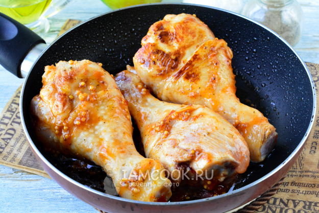 Затем обжарьте куриные голени на сковороде с добавлением растительного масла. Жарьте со всех сторон на среднем огне 7-8 минут, затем убавьте огонь и жарьте еще 10 минут, чтобы мясо почти приготовилось.