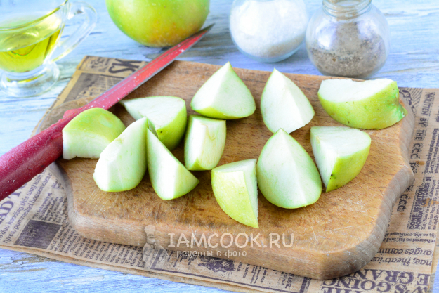 Кисло-сладкие яблоки нарежьте крупными или средними дольками, срезая сердцевинку.