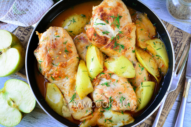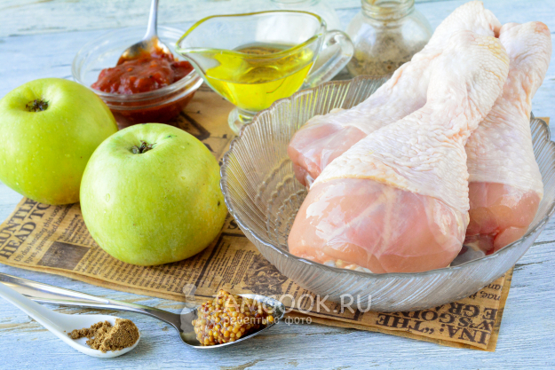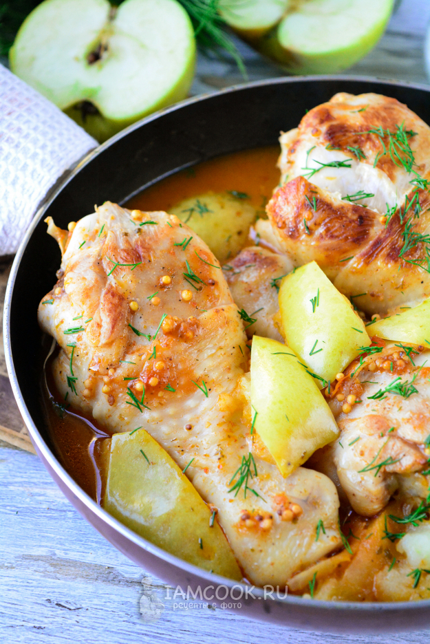 Перед вами необходимые ингредиенты для приготовления курицы с яблоками на сковороде.