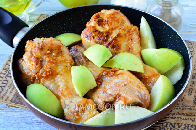 К обжаренной курице выложите в сковороду яблоки и обжаривайте всё вместе на небольшом огне минуты 3.