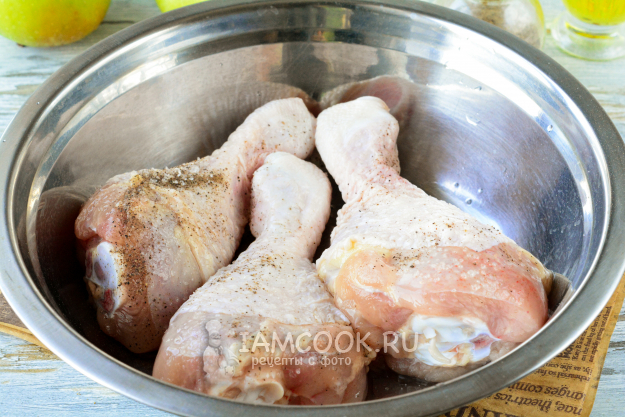 Куриные голени промойте и вытрите насухо бумажными салфетками. Мясо натрите солью и черным молотым перцем.