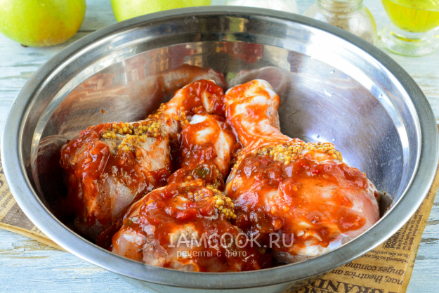 Добавьте к курице молотый кориандр, аджику и дижонскую горчицу. Все перемешайте и оставьте мариновать на 30 минут. Советую аджику брать неострую, чтобы не перебить нежный вкус яблок. Если не найдете неострую аджику, то просто уменьшите ее количество.