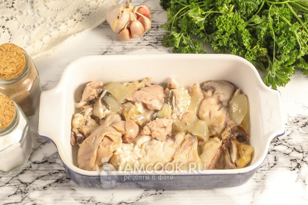 Аккуратно залейте чесночным бульоном и остудите при комнатной температуре 30 минут, а после перенесите в холодильник на 1,5-2 часа.