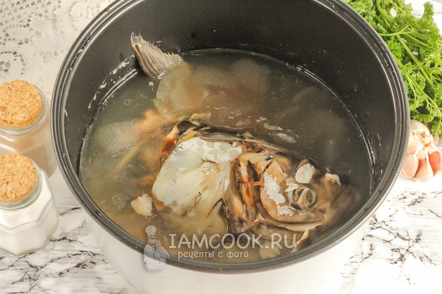 Выложите рыбную голову в чашу мультиварки или в кастрюлю, казан.