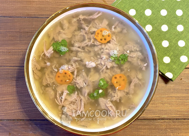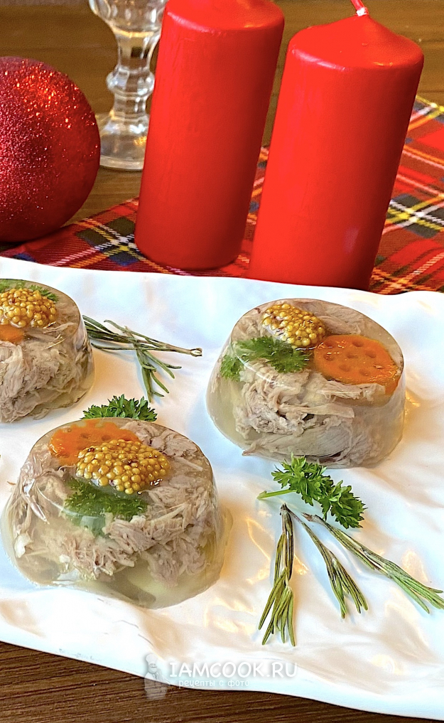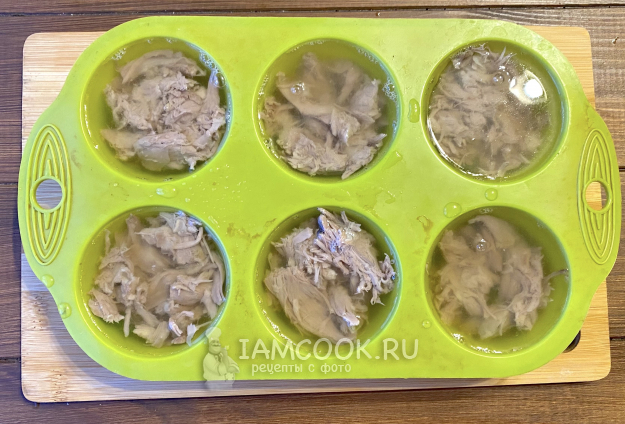 Выложите мясо в подходящие формы и залейте бульоном. Украсьте по своему вкусу.