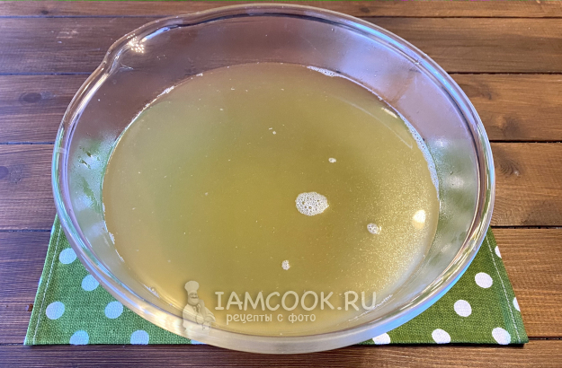 В отлитый и остывший бульон всыпьте желатин и оставьте до набухания. Затем поставьте на огонь и доведите почти до кипения, при этом постоянно помешивайте. ЖЕЛАТИН НЕ КИПЯТИТЬ! Влейте желатин в бульон и перемешайте.