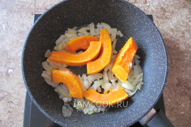 Добавьте к ним куски замороженной тыквы, пусть она пооттает на горячей сковороде. Ориентируйтесь на минут 5.