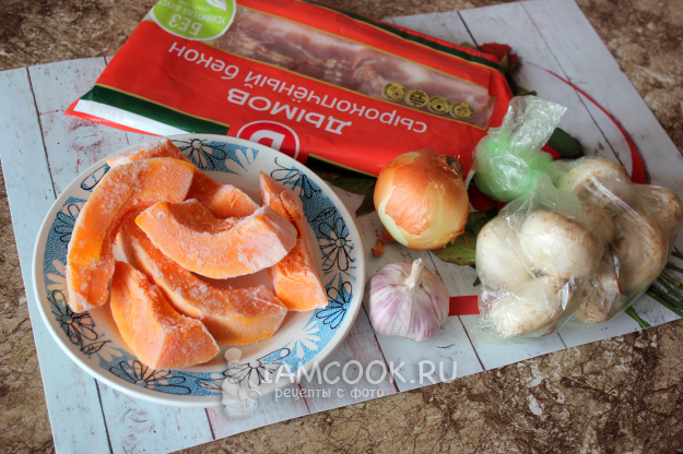Для варианта супа-пюре из замороженной тыквы подготовьте основные и дополнительные ингредиенты по списку к рецепту. Основные это тыква, лук и специи, а для подачи дополнительно возьмите бекон и/или шампиньоны.