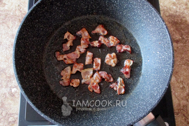 На горячей сковороде при помешивании обжарьте нарезанный на кусочки или ломтики бекон.