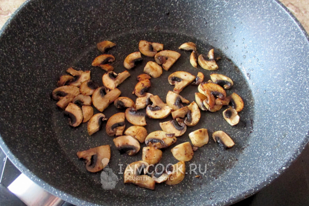 На выплавившемся жиру пожарьте нарезанные тонко шампиньоны. Лучше если они будут лежать на дне сковороды в один слой. Я не солила, а вы ориентируйтесь на свой вкус.