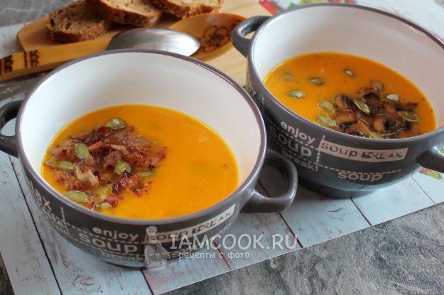 Подавайте суп из замороженной тыквы, сопроводив его жареным беконом и/или жареными шампиньонами.