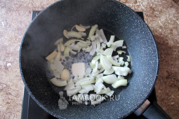 На сливочном масле на сковороде на среднем огне потомите нарезанные лук и чеснок минут 5, до прозрачности. В процессе слегка посолите, обязательно помешивайте.