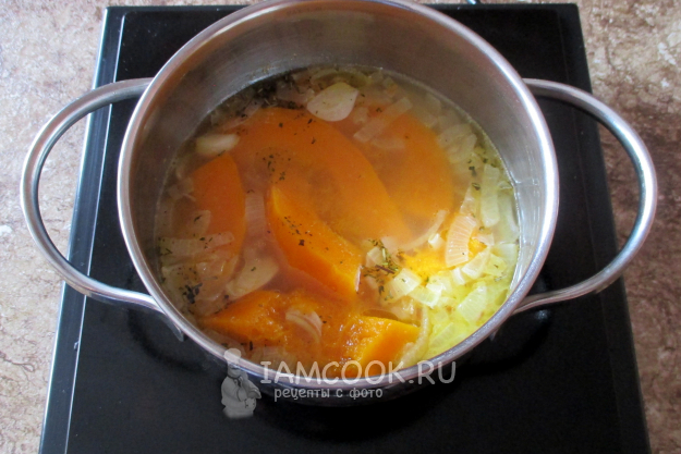 Затем отправьте тыкву, лук и чеснок в кастрюлю с водой. Доведите до кипения, убавьте огонь до слабого и варите или тушите под крышкой до готовности тыквы. Через 20 минут проверьте прокалыванием, мягкая она уже или ещё нет. В конце варки добавьте прованские травы.