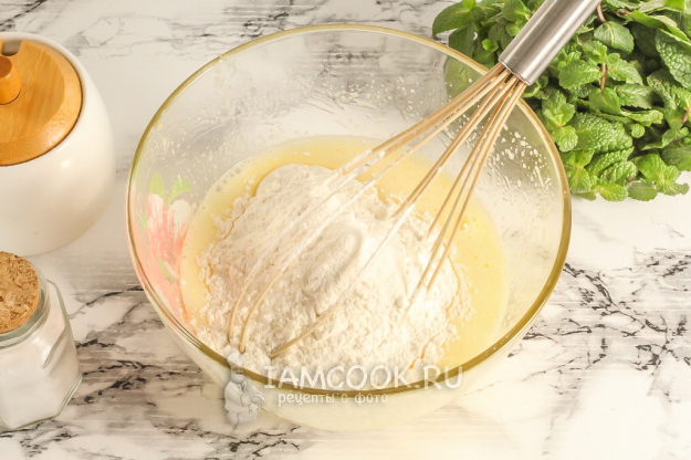Всыпьте по частям пшеничную муку и добавьте разрыхлитель. Но уже не взбивайте, а аккуратно вмешивайте сухие составляющие в яичную массу.