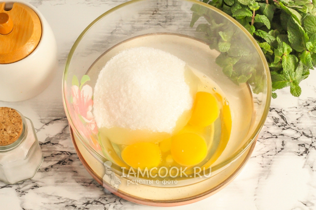 Куриные яйца вбейте в глубокую емкость: салатник или миску с высокими бортиками. Всыпьте туда же сахар, соль и ванильный сахар. По желанию можно всыпать сахар частями, если вам так удобнее будет взбивать.