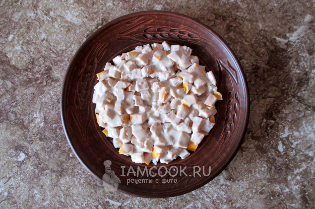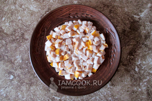 Первый нижний слой – это кусочки-кубики копченой курицы.