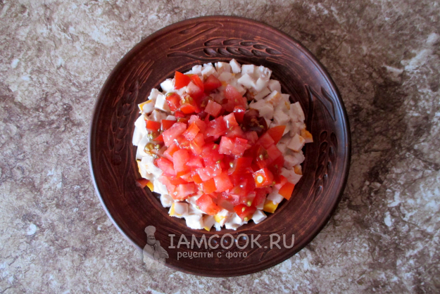 Затем идут кусочки свежих помидоров. Слегонца сопроводите их заправкой.