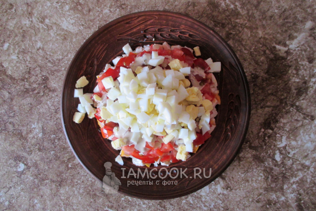 Далее слой из яиц, который нужно уже хорошо заправить.