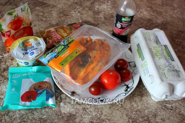 Для салата «Курица под кайфом» подготовьте ингредиенты по списку к рецепту. Подходят копченые или копчено-вареные куриные грудки и/или окорочка (бедра и голени). Яйца нужно заранее сварить вкрутую. По желанию сопроводите при подаче этот салат покупными или самодельными сухариками из белого или темного хлеба.