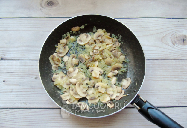 Жарьте грибы с луком до испарения жидкости. Посолите и поперчите.