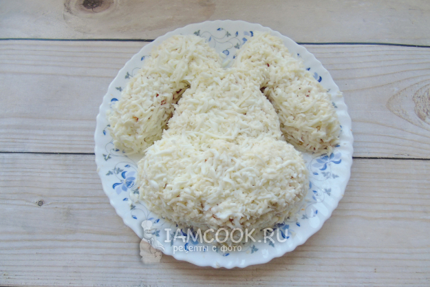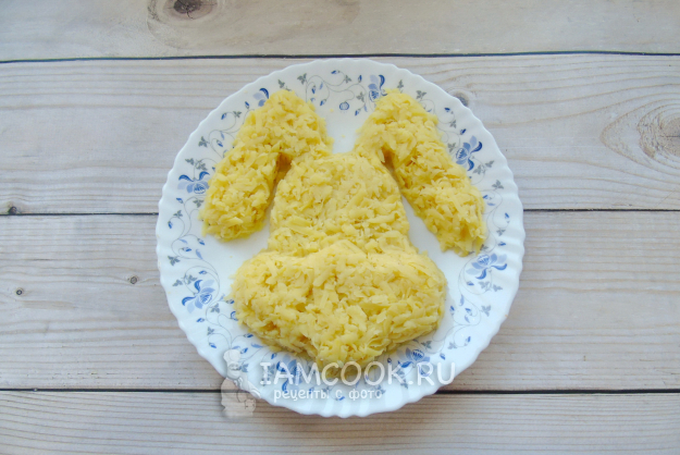 Картофель отварите в кожуре в подсоленной воде. Охладите, очистите и натрите на терке. Выложите на блюдо или большую тарелку в виде кролика с опущенными ушками. Покройте картошку сеточкой майонеза.