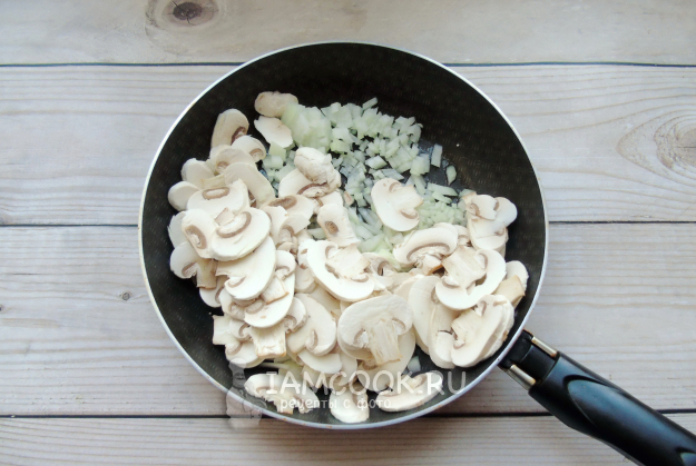 Лук и грибы очистите и помойте. Лук мелко нарежьте, а грибы нарежьте пластинками. Выложите в сковороду с подсолнечным маслом.