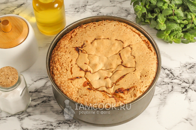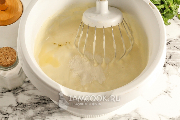 Смажьте форму растительным маслом, а оставшееся масло влейте в тесто. Всыпьте разрыхлитель или погасите 1 ч.л. соды 6% уксусом. Тщательно размешайте, но не взбивайте, чтобы не выпустить из теста пузырьки воздуха.