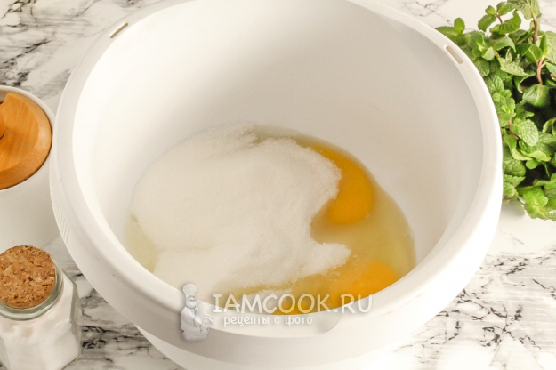 Вбейте в чашу миксера или кухонного комбайна куриные яйца, всыпьте соль и сахарный песок. Взбейте примерно 3-4 минуты на самой высокой скорости техники в пышную пену.