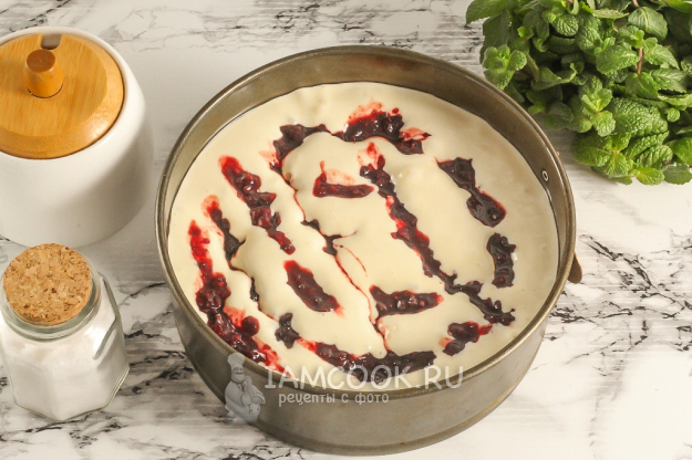 Разогрейте духовку до 180 градусов. Перелейте бисквитное тесто в форму и выложите сверху варенье. Старайтесь это сделать равномерно, чтобы оно осталось на поверхности, а не сразу же утонуло в тесте. Поместите форму с заготовкой в духовку на 25-30 минут.